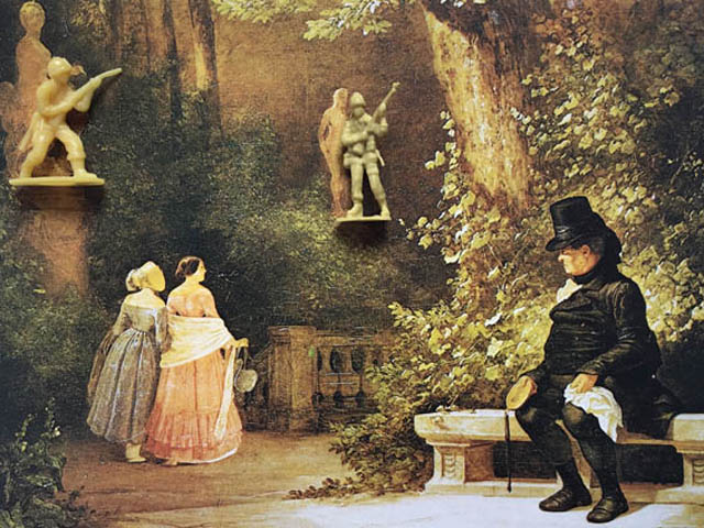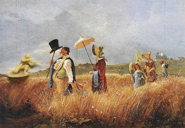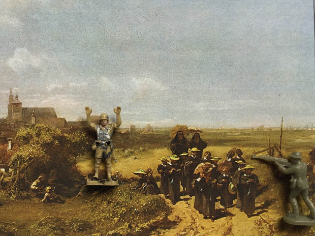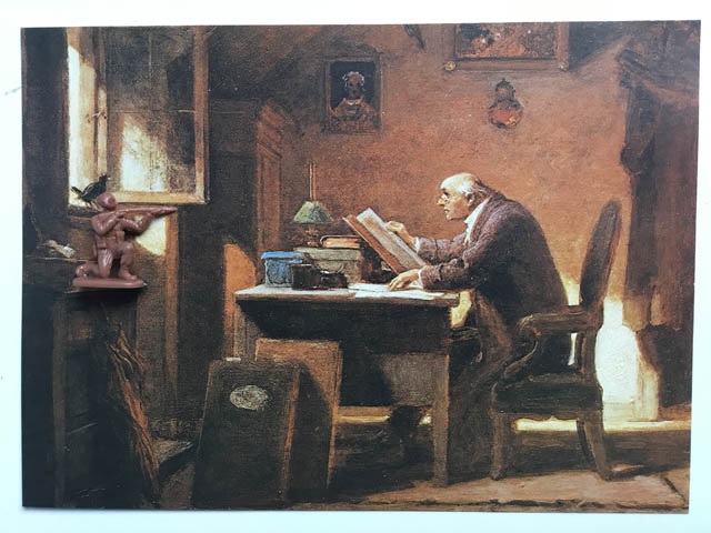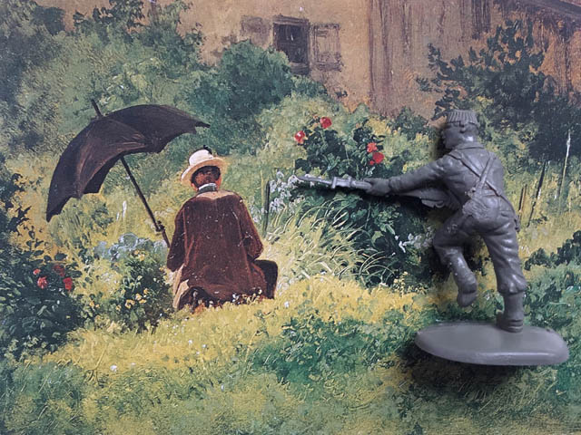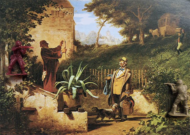 Die „Spitzwegassemblagen“ bestehen aus einer 8-teiligen Postkartenserie von Gemälden des Malers der Romantik Carl Spitzweg in Kombination mit Spielzeugsoldaten. Die Idylle auf Spitzwegs romantisierten Szenen des Alltagslebens des 19. Jahrhunderts wird immer wieder durch, häufig erst auf den 2. Blick zu erkennende Spielzeugsoldaten, ergänzt und erhält dadurch einen anderen Kontext.