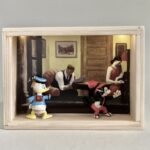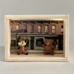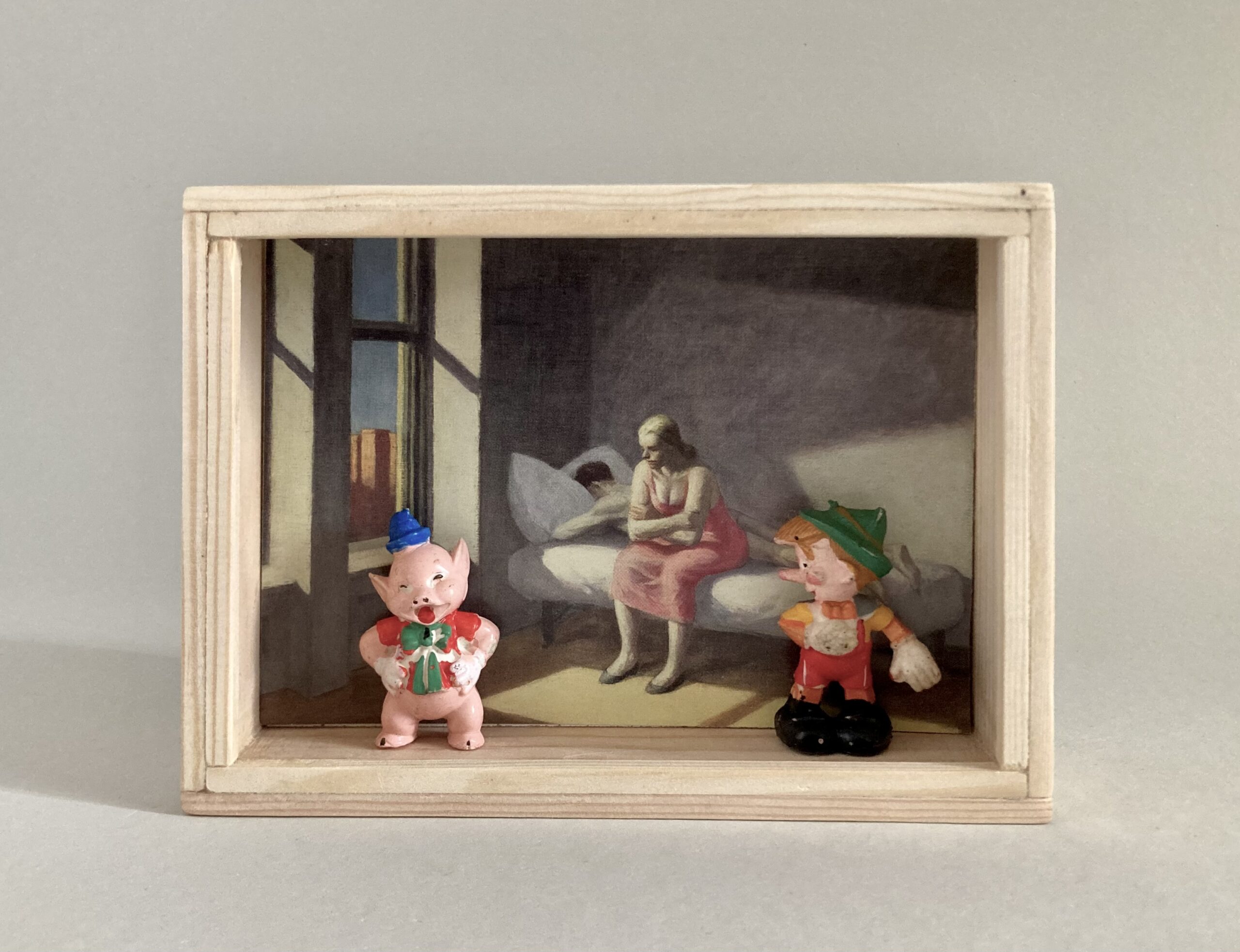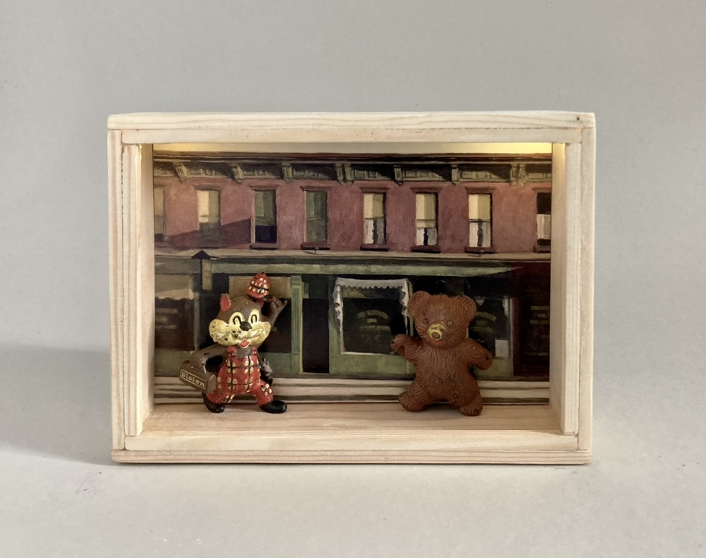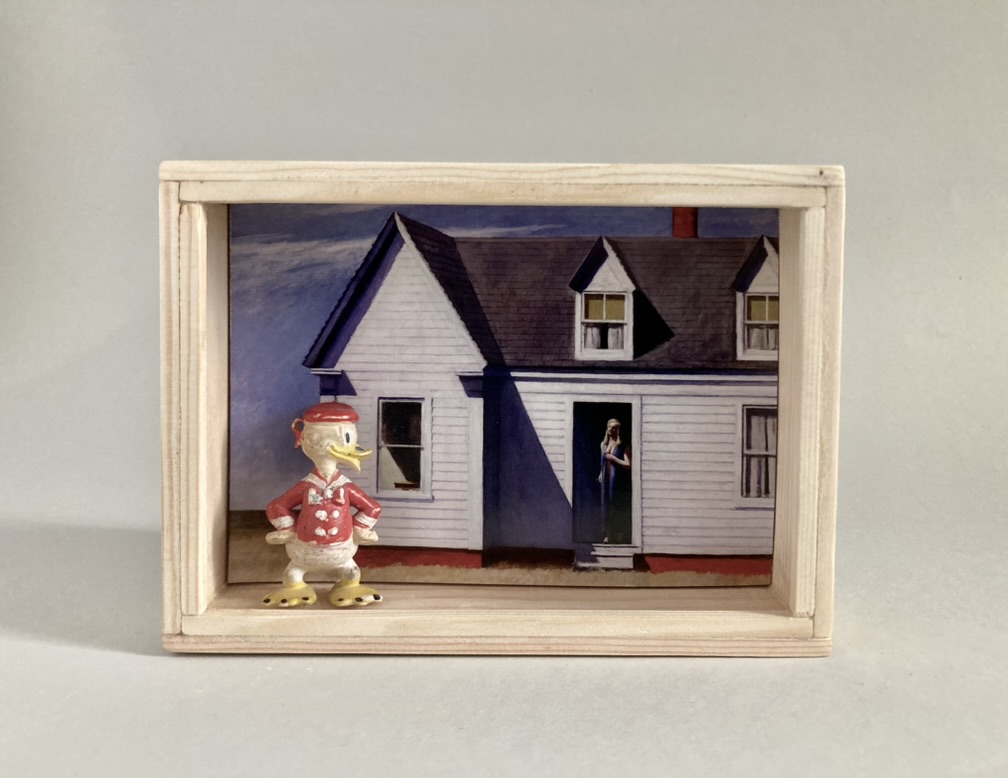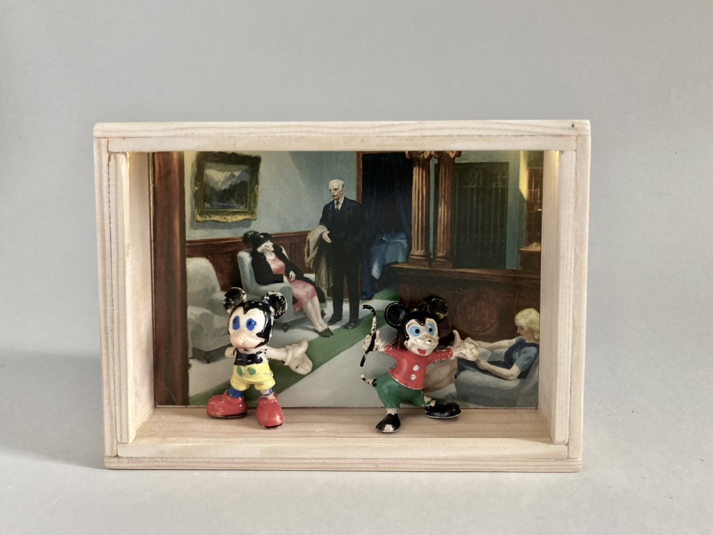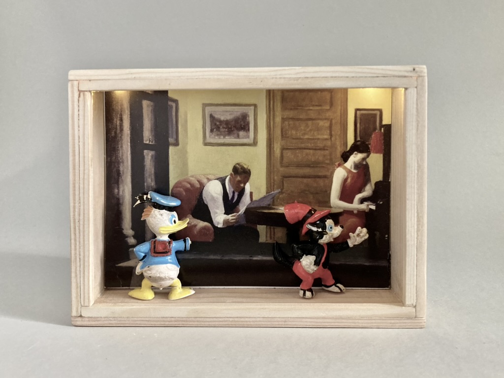 „Once Upon A Time In America“ – das sind 12 Assemblagen in kleinen, beleuchteten Kästen, bestehend aus Postkarten und Spielzeugen. Der Titel der Serie hat weniger mit dem gleichnamigen Film zu tun, als mit dem spontanen Ausruf einer Betrachterin dieser Serie. Ja, es geht sehr amerikanisch zu. Auf den Postkarten sind Motive des amerikanischen Malers Edward Hopper zu sehen, die Spielzeuge stammen zwar aus den 60iger Jahren, zeigen aber mit Micky Maus, Donald und Goofy z.B. eher popkulturelle, amerikanische Produkte, die viele Generationen geprägt haben. Sie sind ebenfalls Produkte der dreissiger und vierziger Jahre. Die Spielzeuge erweitern, karikieren und spielen mit den Abbildungen der Kunst von Edward Hopper.