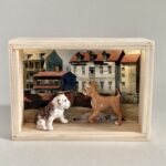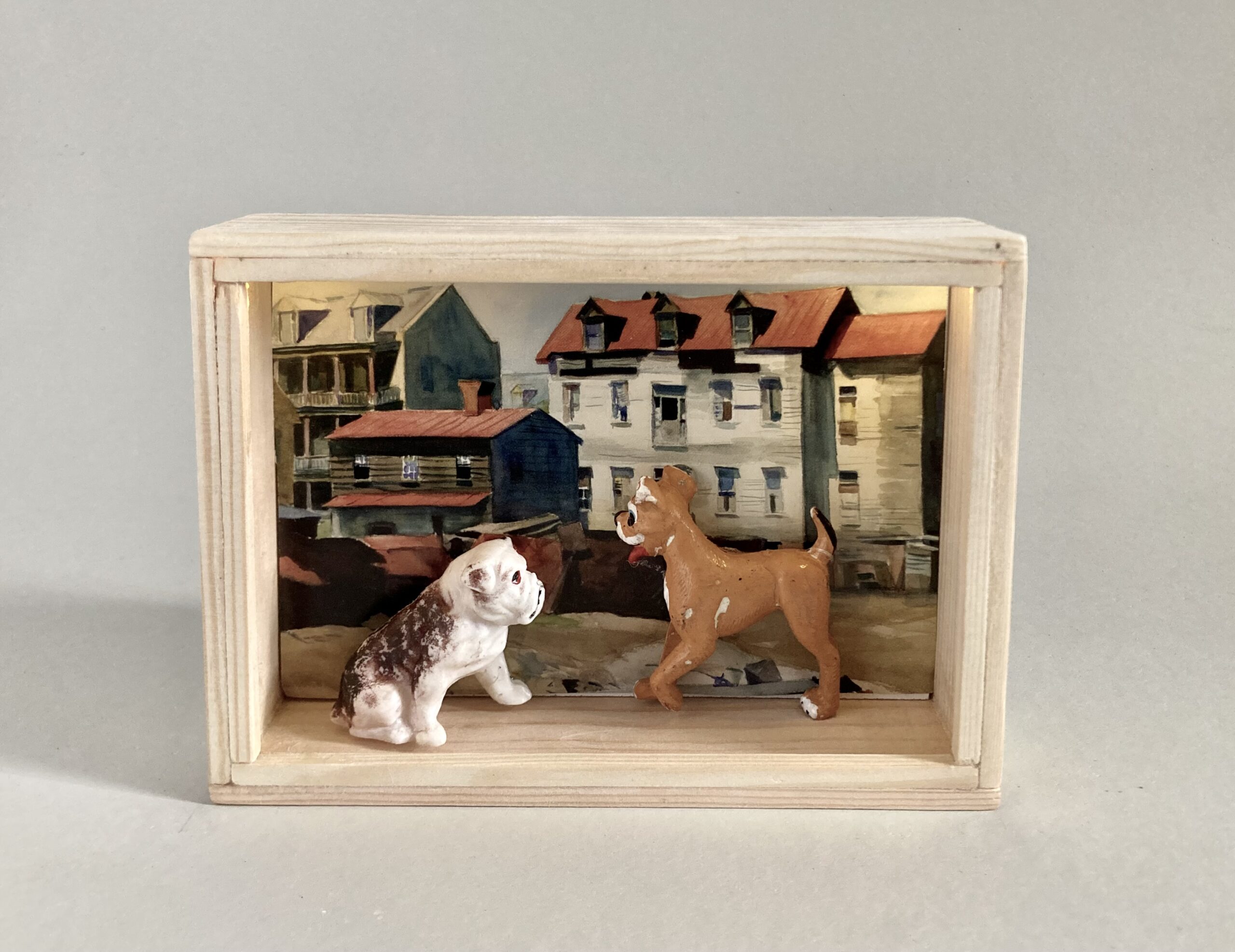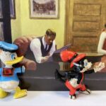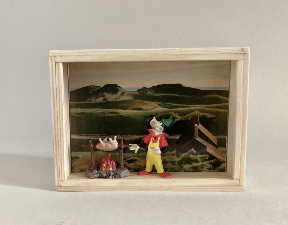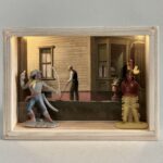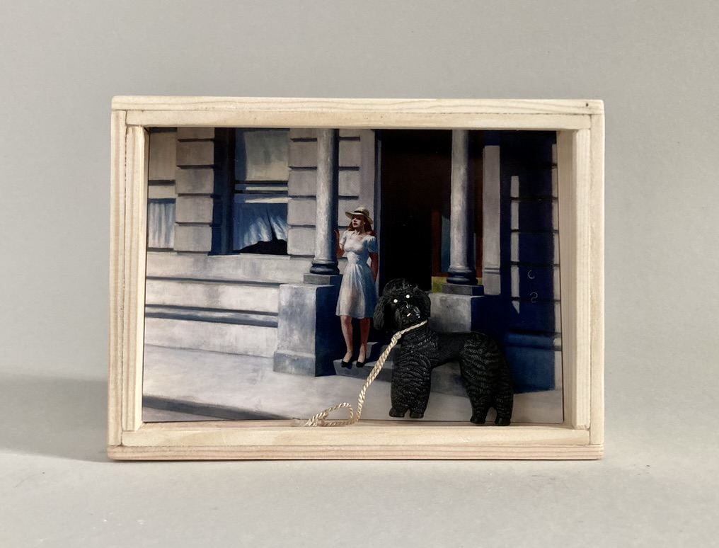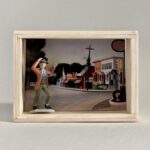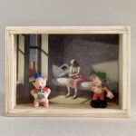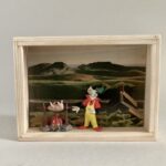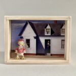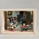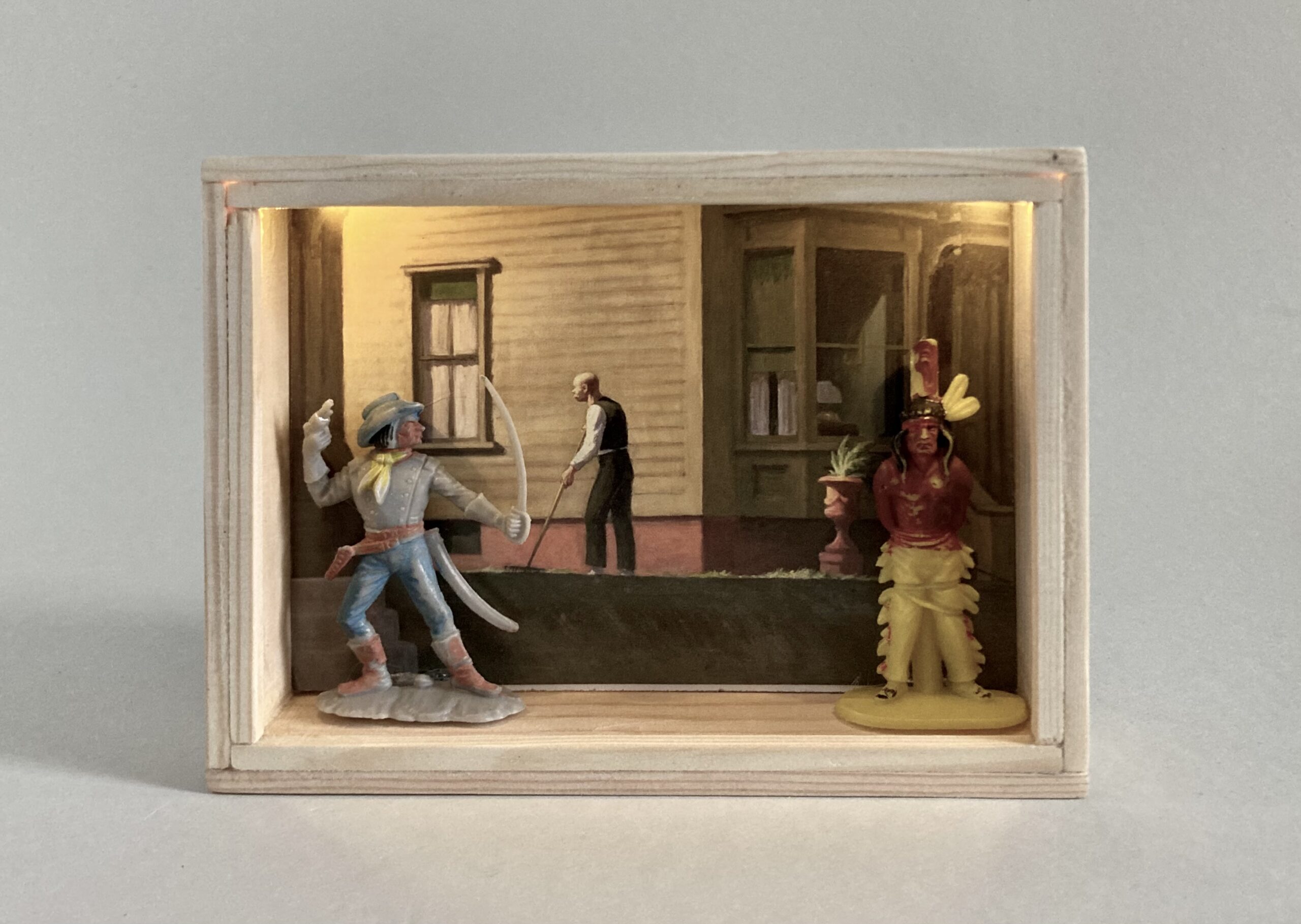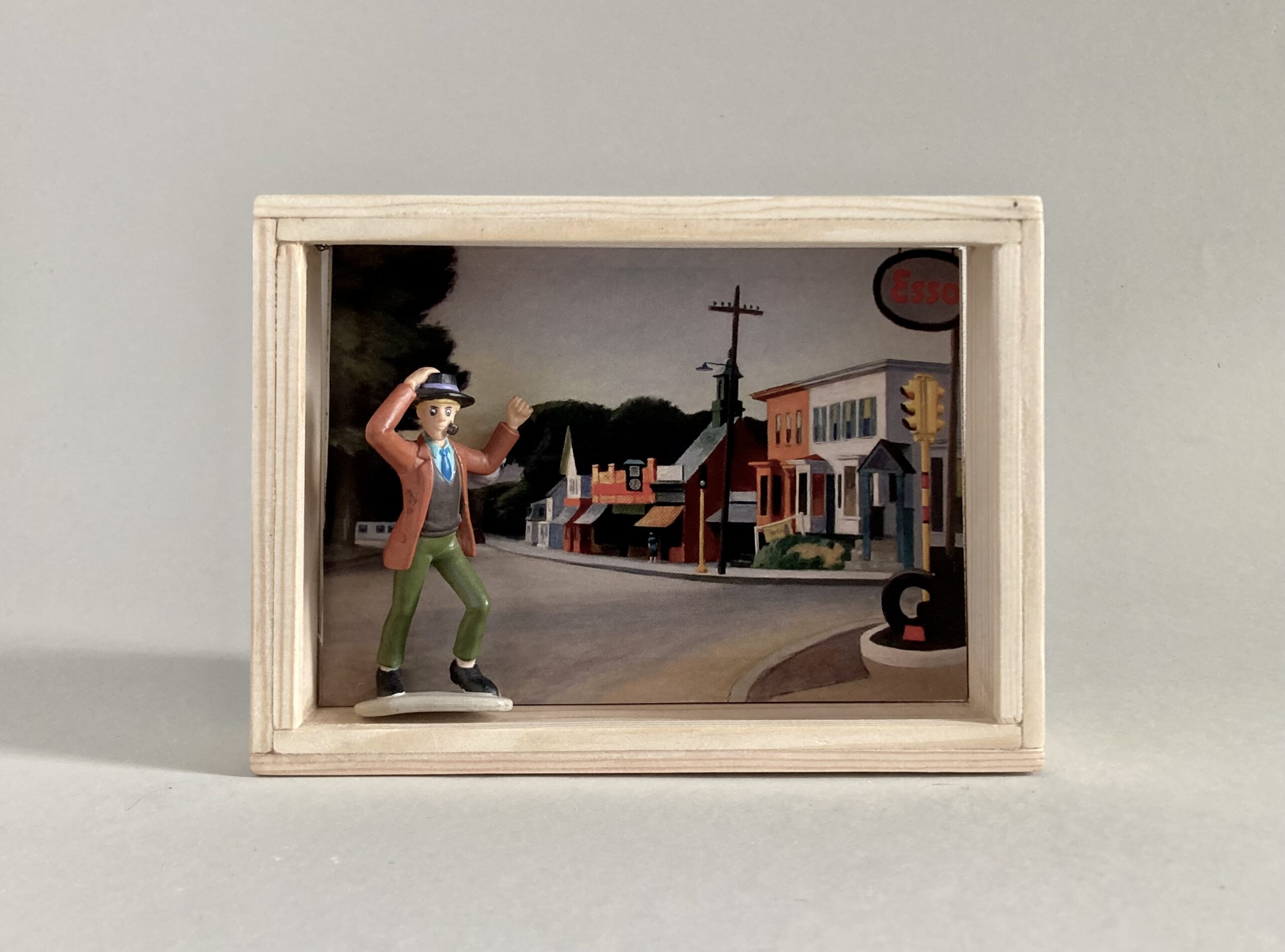 „Once Upon A Time In America“ – das sind 12 Assemblagen in kleinen, beleuchteten Kästen, bestehend aus Postkarten und Spielzeugen. Der Titel der Serie hat weniger mit dem gleichnamigen Film zu tun, als mit dem spontanen Ausruf einer Betrachterin dieser Serie. Ja, es geht sehr amerikanisch zu. Auf den Postkarten sind Motive des amerikanischen Malers Edward Hopper zu sehen, die Spielzeuge stammen zwar aus den 60iger Jahren, zeigen aber mit Micky Maus, Donald und Goofy z.B. eher popkulturelle, amerikanische Produkte, die viele Generationen geprägt haben. Sie sind ebenfalls Produkte der dreissiger und vierziger Jahre. Die Spielzeuge erweitern, karikieren und spielen mit den Abbildungen der Kunst von Edward Hopper.